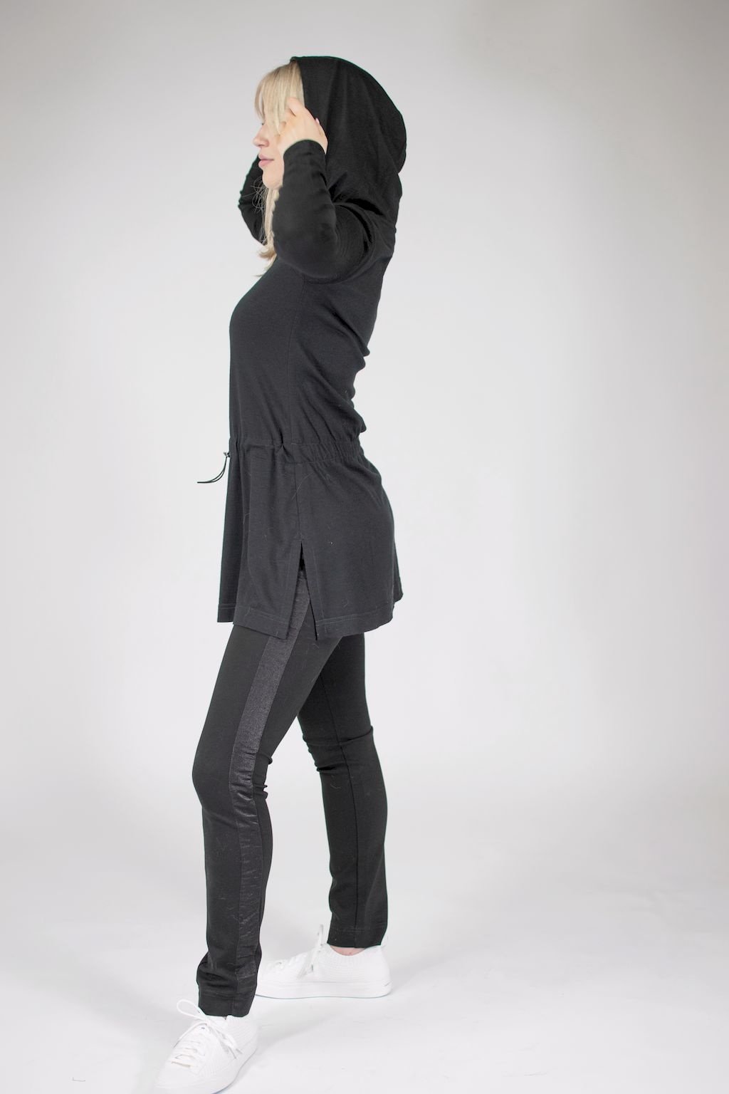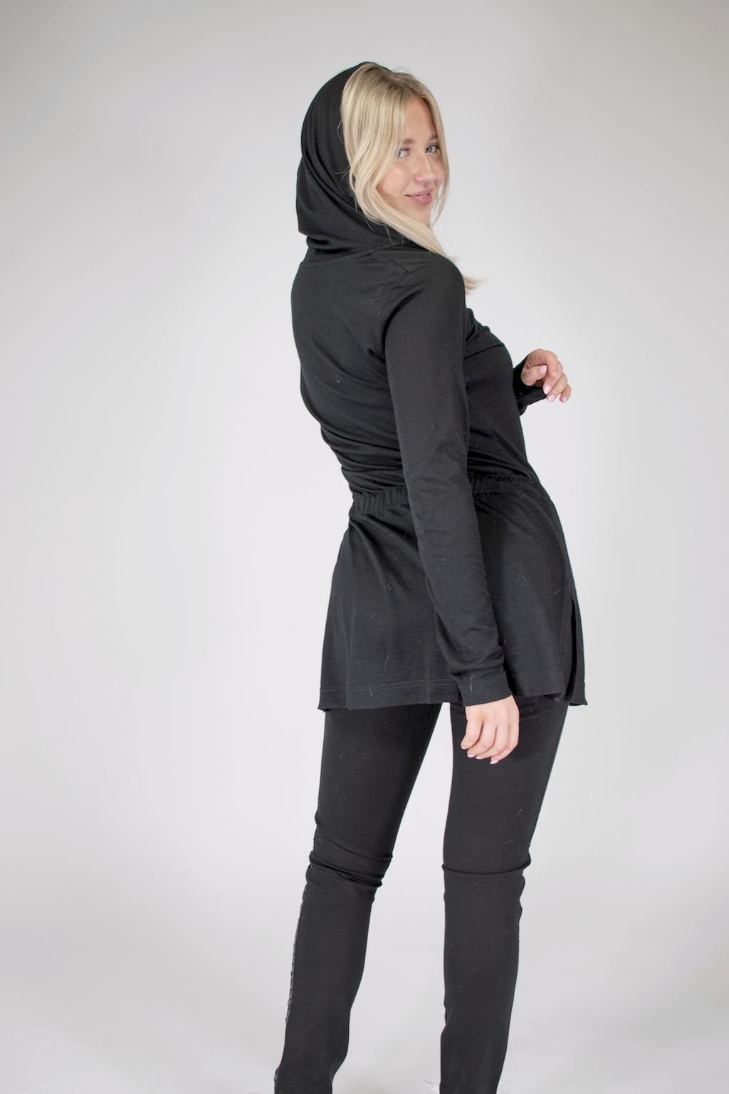 Dámská černá tunika s kapucí a dlouhým rukávem, v pase na stažení ozdobnou gumičkou, po stranách s rozparky.