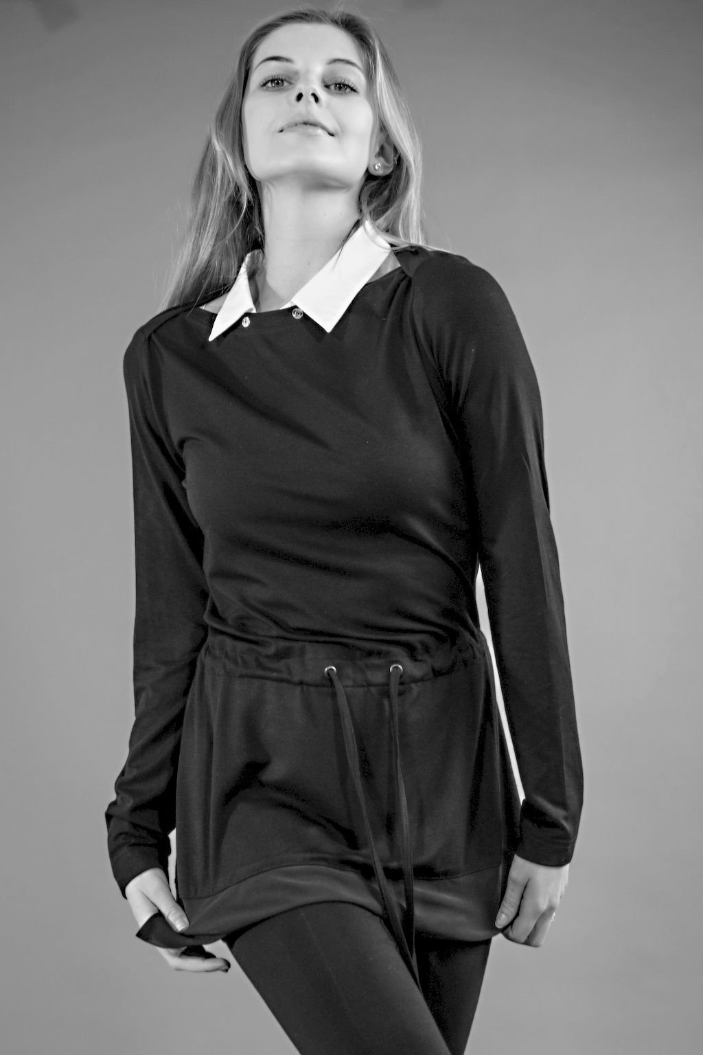 Úpletová tunika s dlouhým rukávem, šifonovým okrajem na délce, doplněná o bílý odepínací límec, v pase s vazačkou, vhodná pro společenskou i pracovní příležitost.