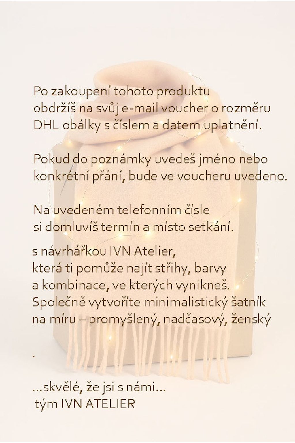 Při zakoupení tohoto dárkového voucheru na Tvůj e-mail přijde očíslovaný dárkový voucher v hodnotě 1 000 KČ, s platností na 6 měsíců od data pořízení. Voucher se vztahuje na osobní setkání s naší návrhářkou Ivankou, která Vám odborně poradí s celým kapsulovým šatníkem, vhodnými střihy, barvami i stylem, který se hodí přímo k vaší osobnosti. Nebo, jen poradí s jedním jedinečným modelem, který podtrhne vaší osobnost.